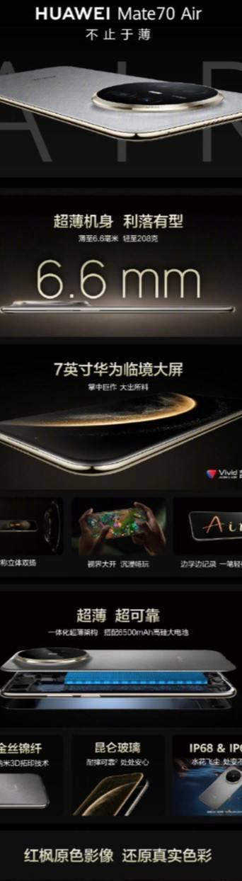 从官网公布信息可以看到,华为Mate70 Air整机厚度只有6.6mm、轻至208g,官方提供曜金黑、羽衣白、金丝银锦三种配色,外观造型与Mate70系列相差不大。其配备的7英寸大屏通过了菁彩视听Audio & HDR Vivid认证,引入的超耐用锦纤、昆仑玻璃、IP68防尘防水/IP69抗高温高压喷水,让手机抗冲击、耐摔、极端环境应用能力大幅提升。